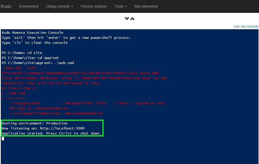 So let’s move to Powershell debug console and let’s move to /site/approot folder to check if the whole infrastructure works. Once Powershell console opens, let’s run web.cmd via console and check what happens.